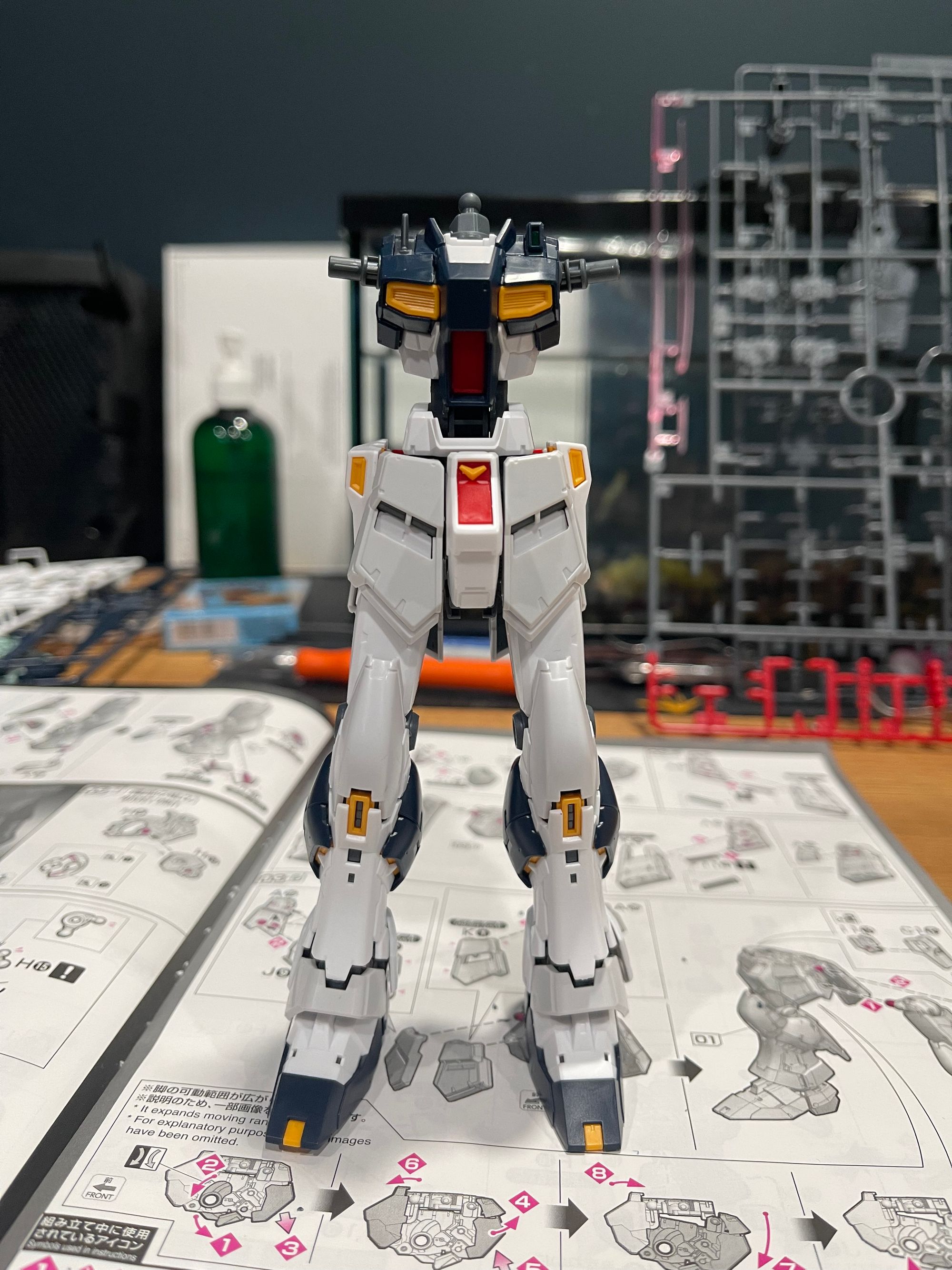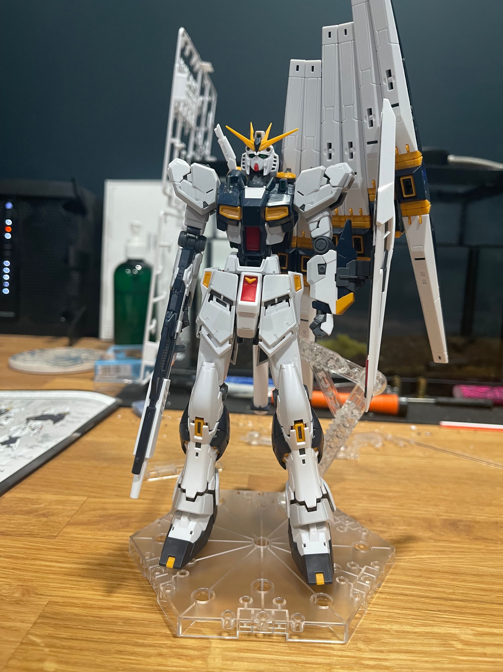 Once the kit is fully constructed after snap building, I take a close inspection and ensure there is nothing missing, misaligned, or off. I have recently gotten into the habit of cleaning my pieces after the building is complete to remove any factory oils or finger/skin oils. The reasoning for this is to allow for panel lines to be filled cleaner and apply stickers or water slides decals properly. If residue remains on the pieces, the stickers will begin to lift or peel. This results in a bad-looking model and is not something I want. I learned this the hard way after seeing some of my decals popping off of my HGUC Xi. Another benefit is that if you intend to topcoat a model (did not topcoat my Nu) it is required to clean your piece otherwise the coating will not adhere properly. The only mobile suit that I have coated currently is my HG Gouf.