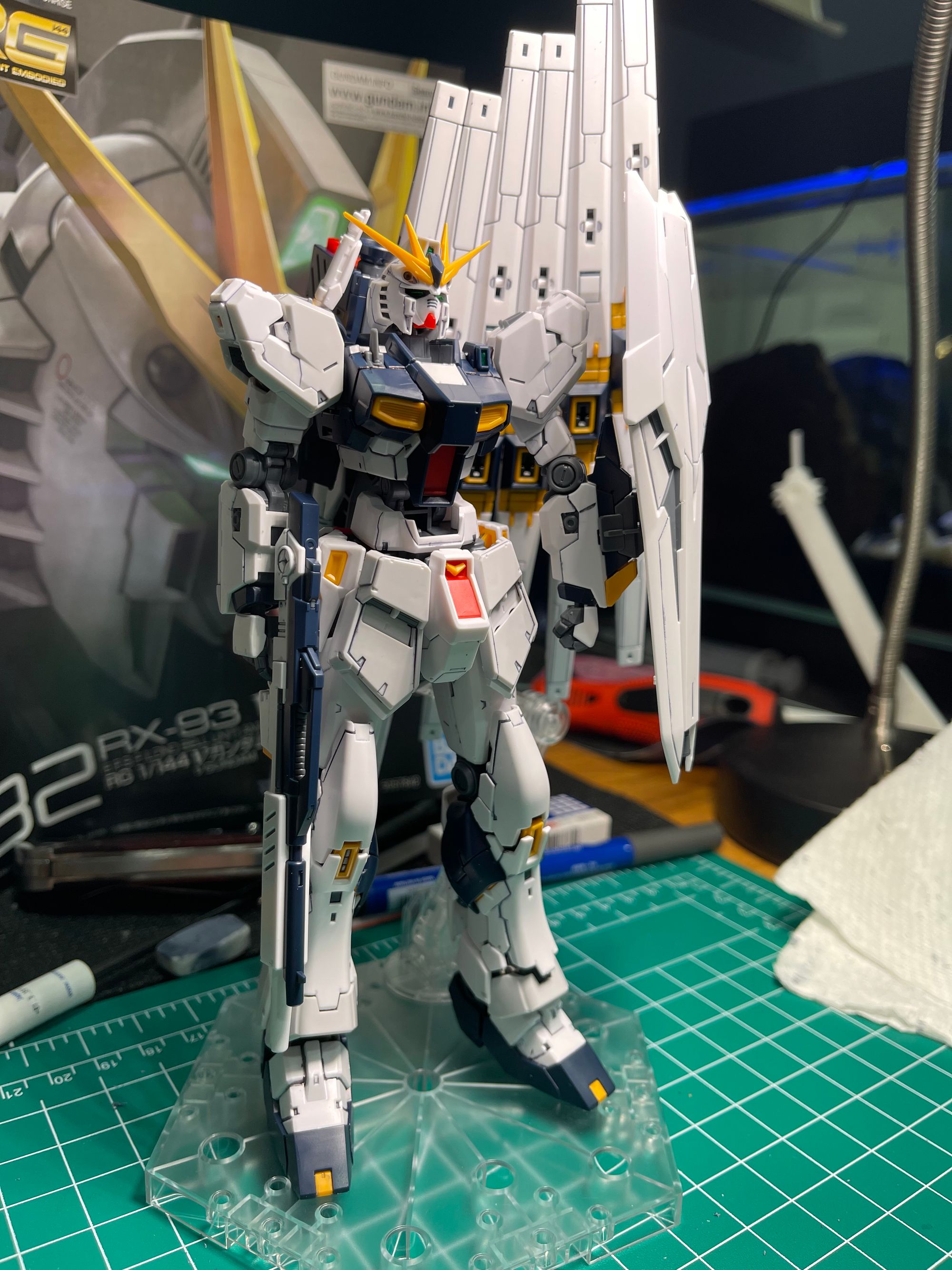 The RG Nu is one of my favorite builds to this day with the exception of the RG Hi-Nu. This newer Real-Grade Gundam definitely provides that itch of Master Grade quality at a High-Grade scale. Although it's on a 1/144 scale, it is much larger than a typical Real Grade. This allows the Nu to have more height, width, and detail across all facets. The waistline of the Nu is about as tall as a full HG RX-78 V2.
